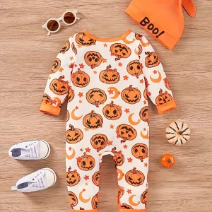 Barboteuse bébé Halloween – body manches longues motif citrouille et étoiles