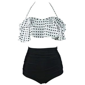 Maillots de Bain Vintage à volants blancs à pois noirs