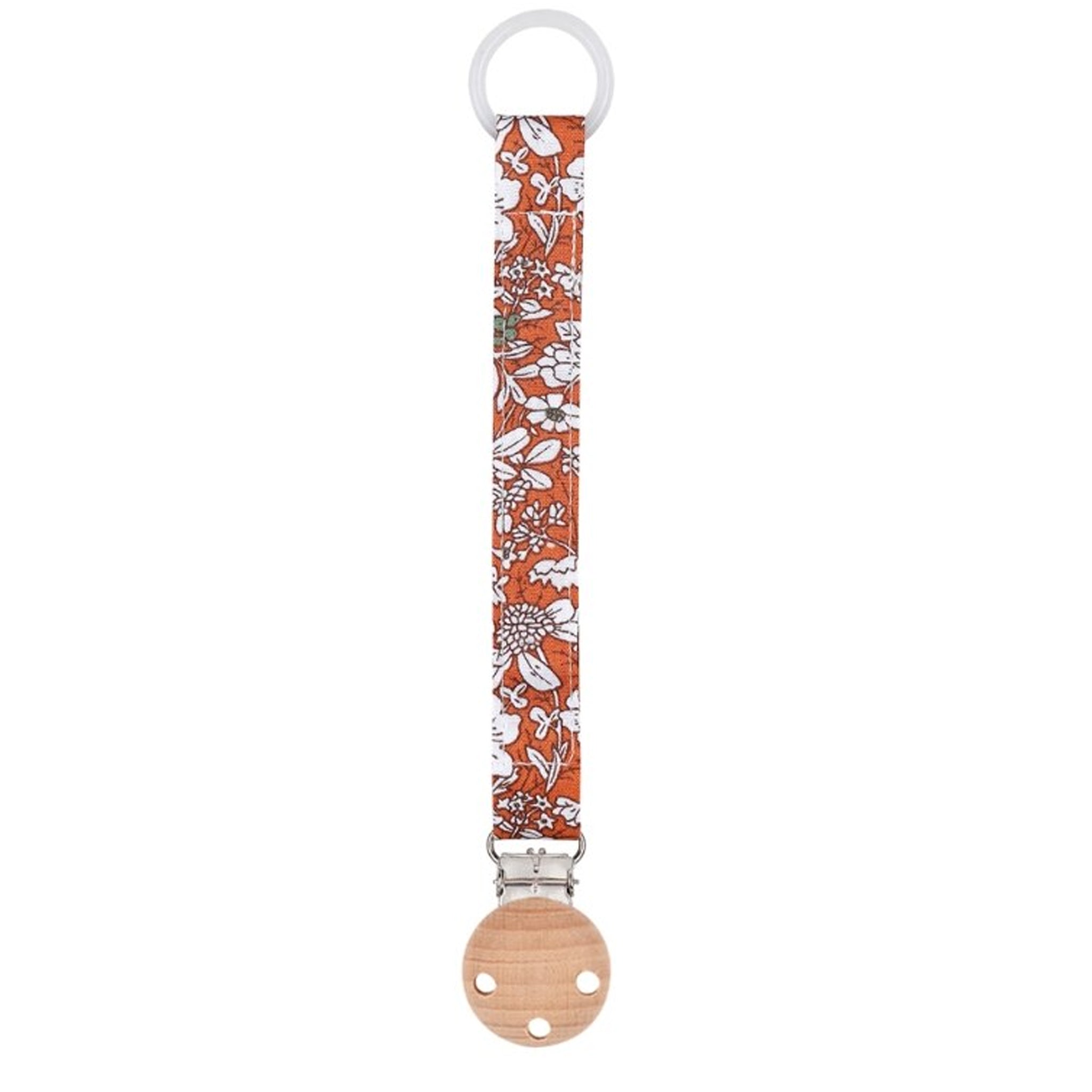 Cet attache sucette aux motifs fleuris sur un fond couleur brique est parfait pour éviter que la tétine ne se perde ! Il est en coton et bois pour un toucher doux et durable, et est complété par un anneau en silicone qui facilite l’attache et le retrait de la sucette. Sa longueur est d’environ 22 cm, ce qui permet à votre bébé de porter son attache sucette tout en confort. Il est disponible en plusieurs couleurs et est lavable à la machine.