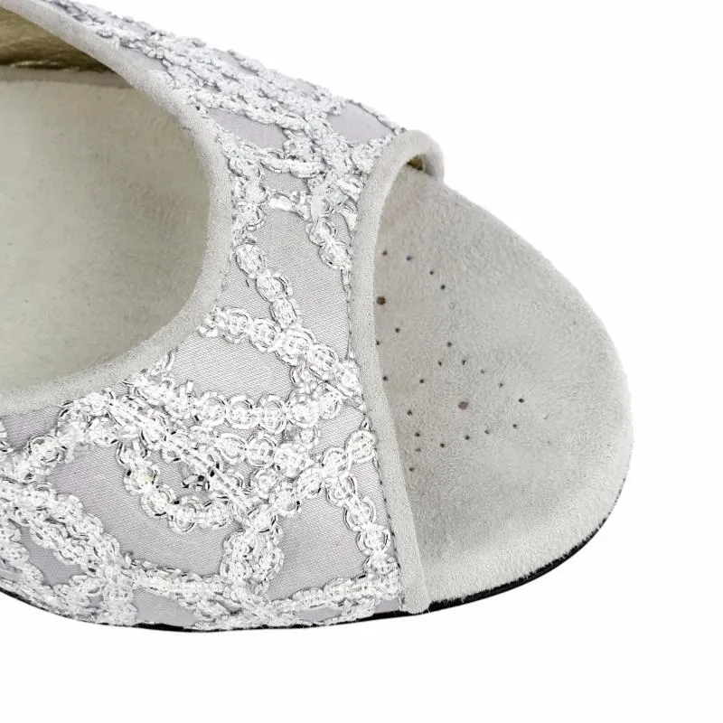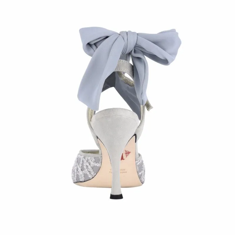 • Fermeture par une bride en daim grise autour de la cheville et un ruban modulable gris