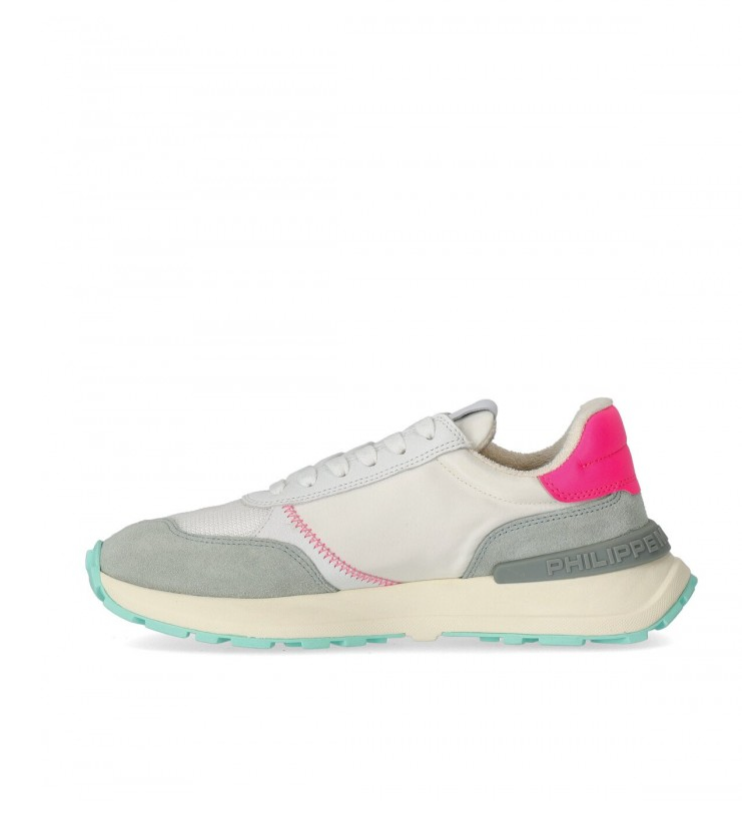 Baskets de la marque Philippe Model modèle Antibes, en nylon de couleur blanc et avec de la suède grise et des semelles vert d’eau. Fabriquées en Italie.