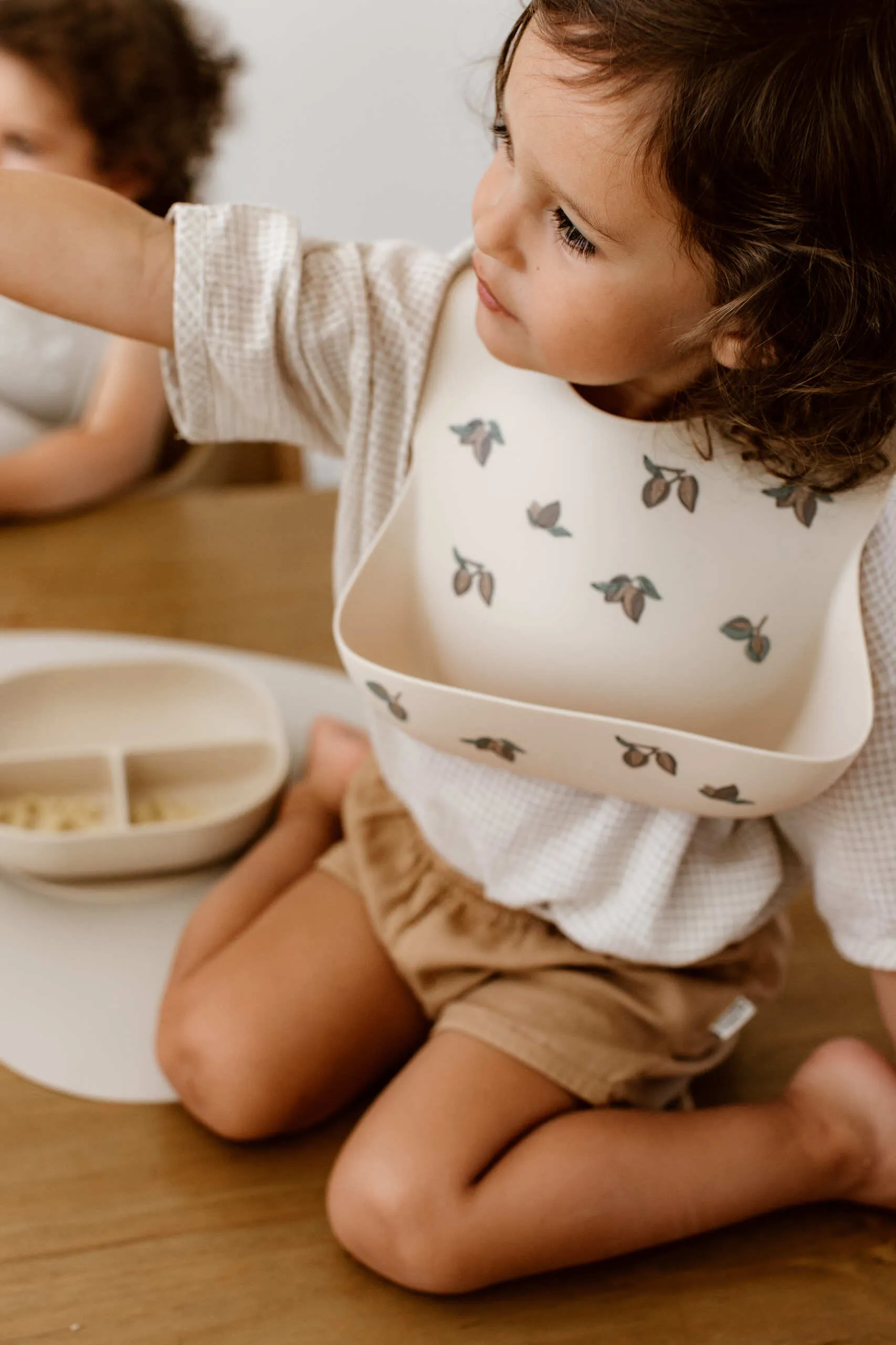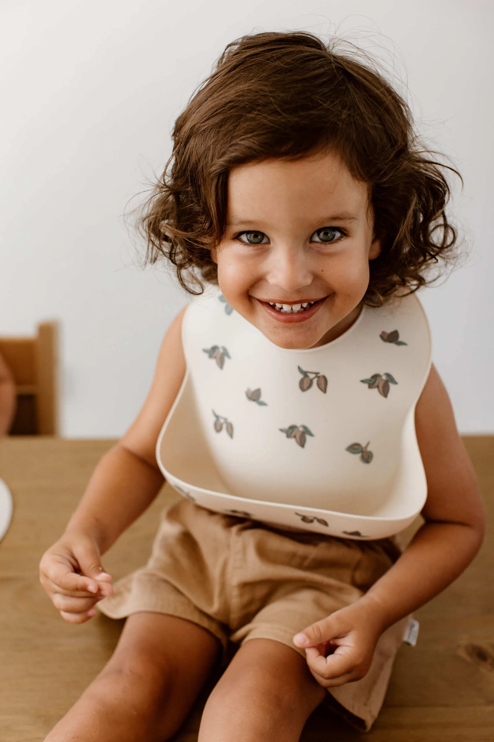 Le joli bavoir en silicone souple Amandes – de chez Zakuw – est idéal pour garder les vêtements de votre bébé propres durant ses repas !