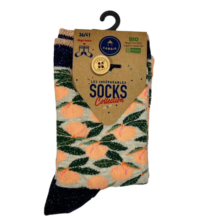 Chaussettes pour femme avec des motifs fruités pour des looks vitaminés. Les chaussettes sont fabriquées avec 80% de matériel organique et elles sont véganes.