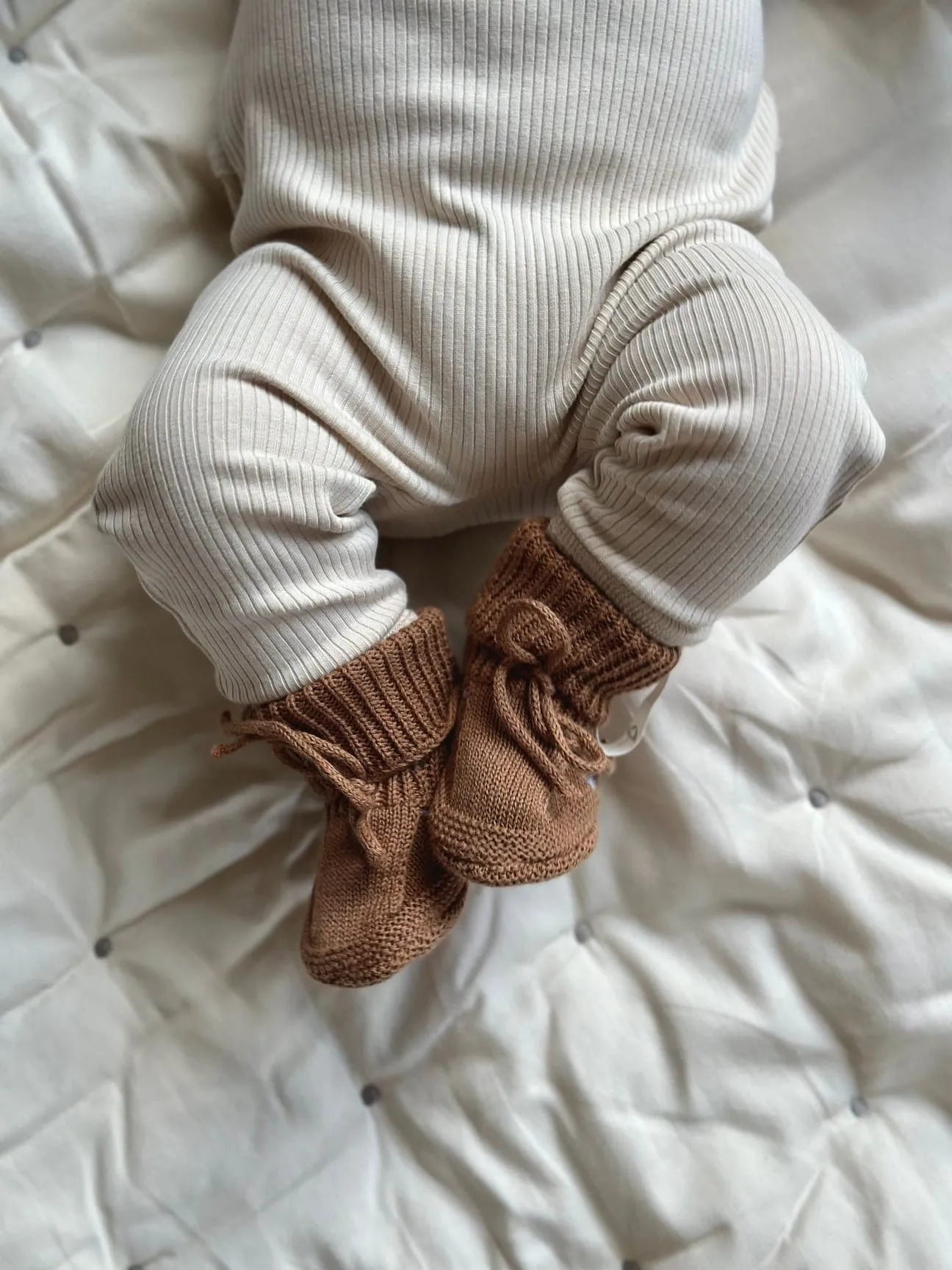 Pratiques et confortables, ils tiendront bien au chaud les petits pieds de bébé, grâce à leurs liens ils sont ajustables !