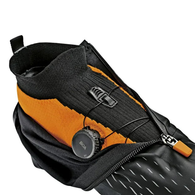 - Couvre-chaussure softshell extensible : composé de trois couches imperméables et respirantes, avec traitement hydrofuge DWR pour repousser l’eau et la boue.
