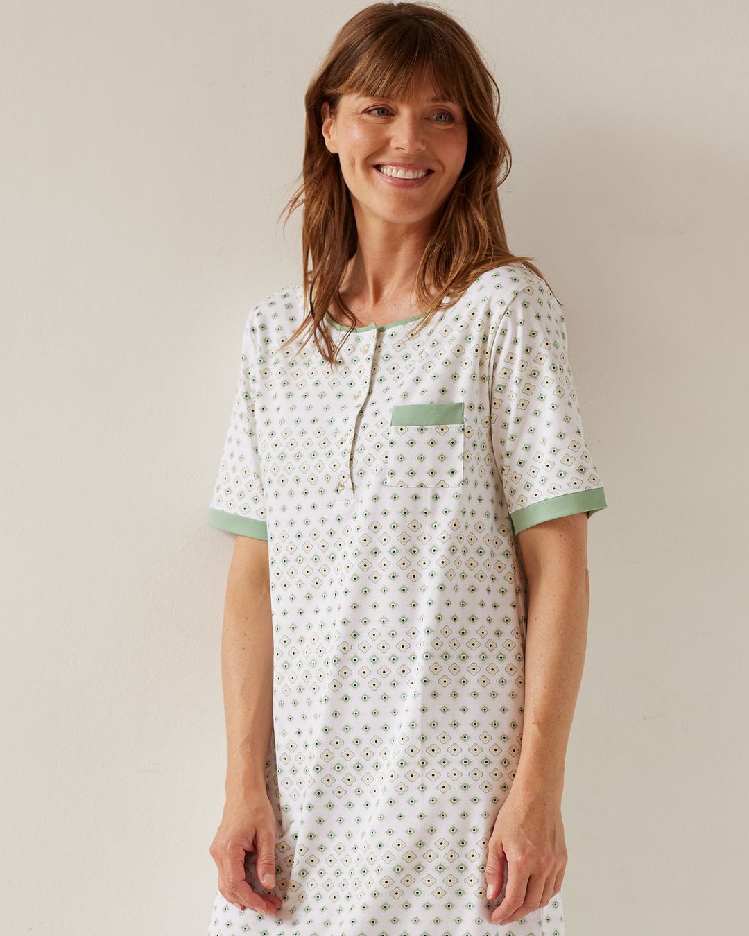 La chemise de nuit Helio de la marque Canat est une chemise de nuit blanche à motifs vert menthe.