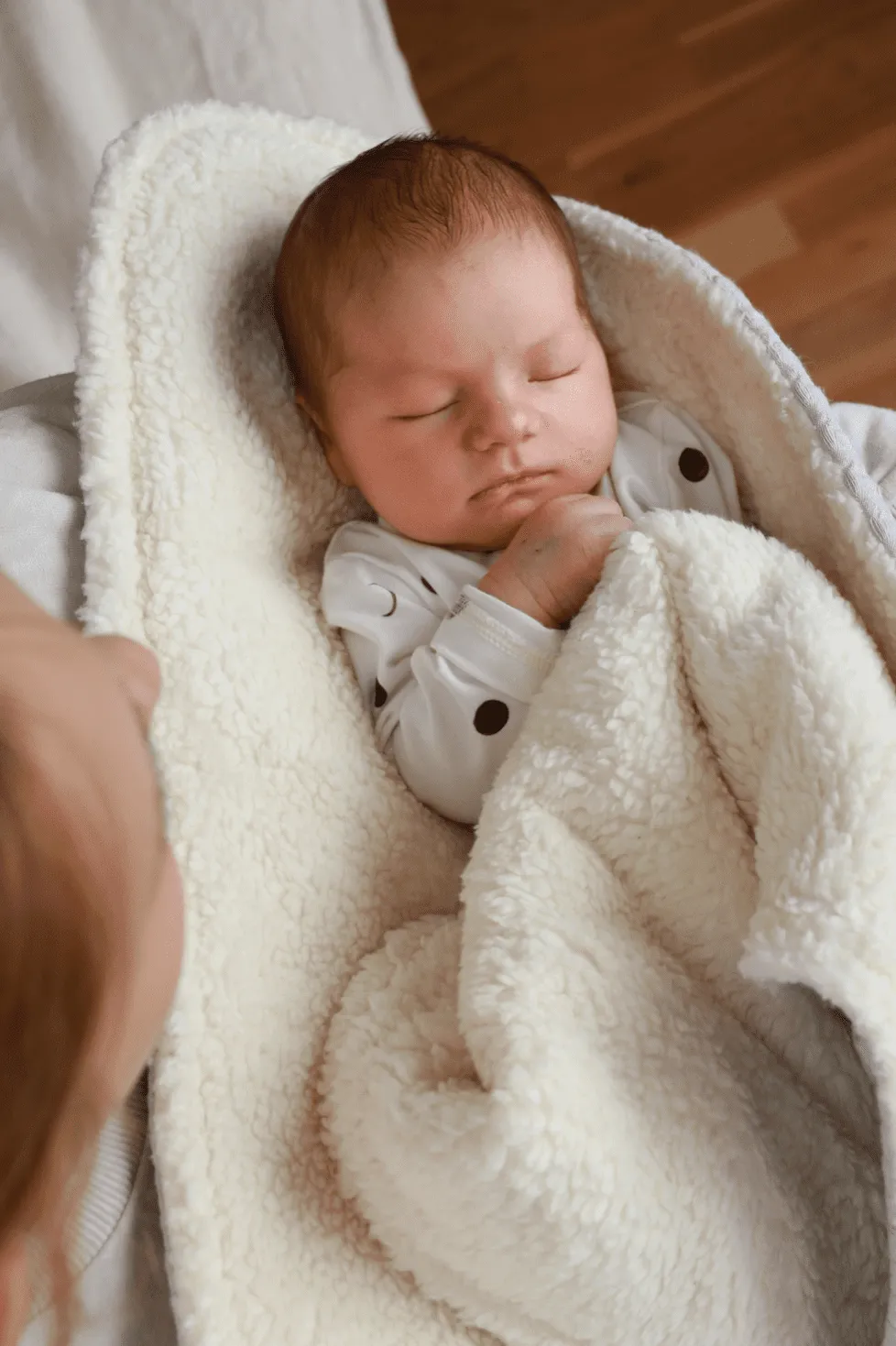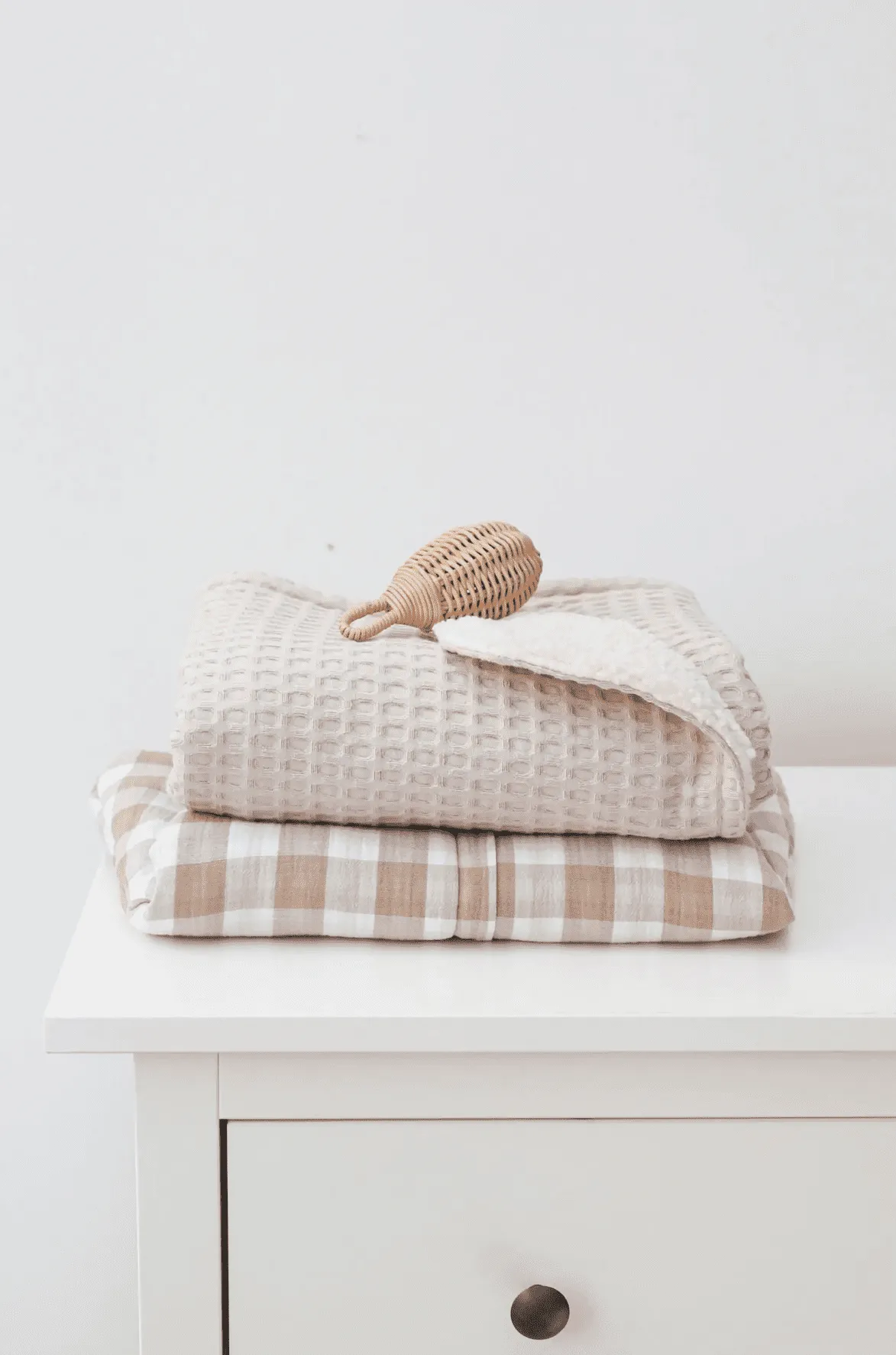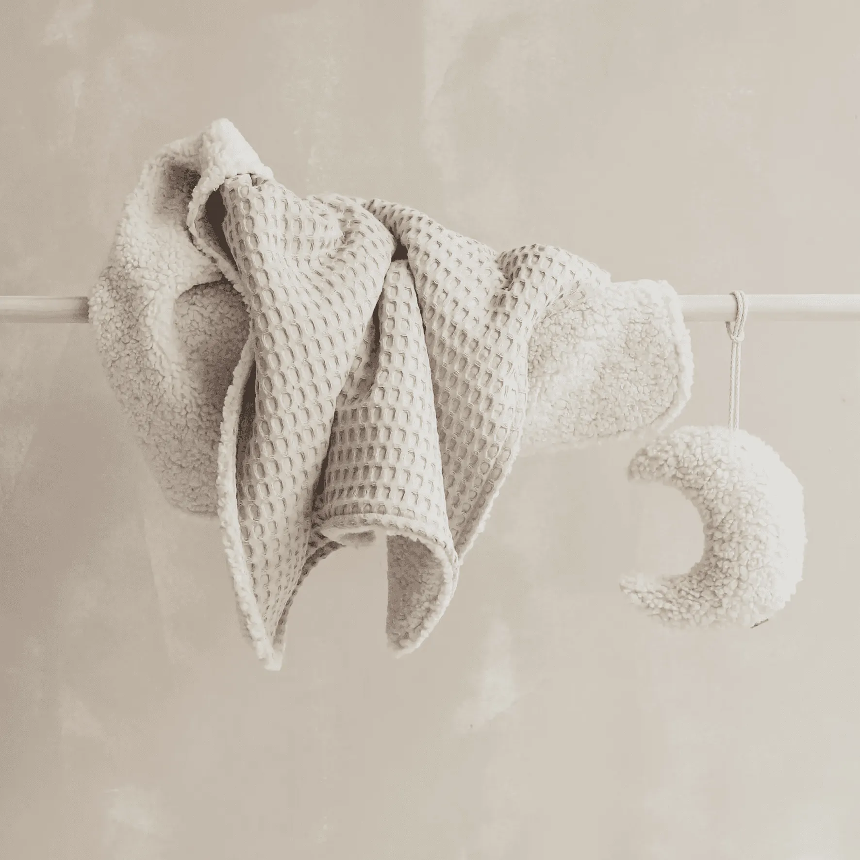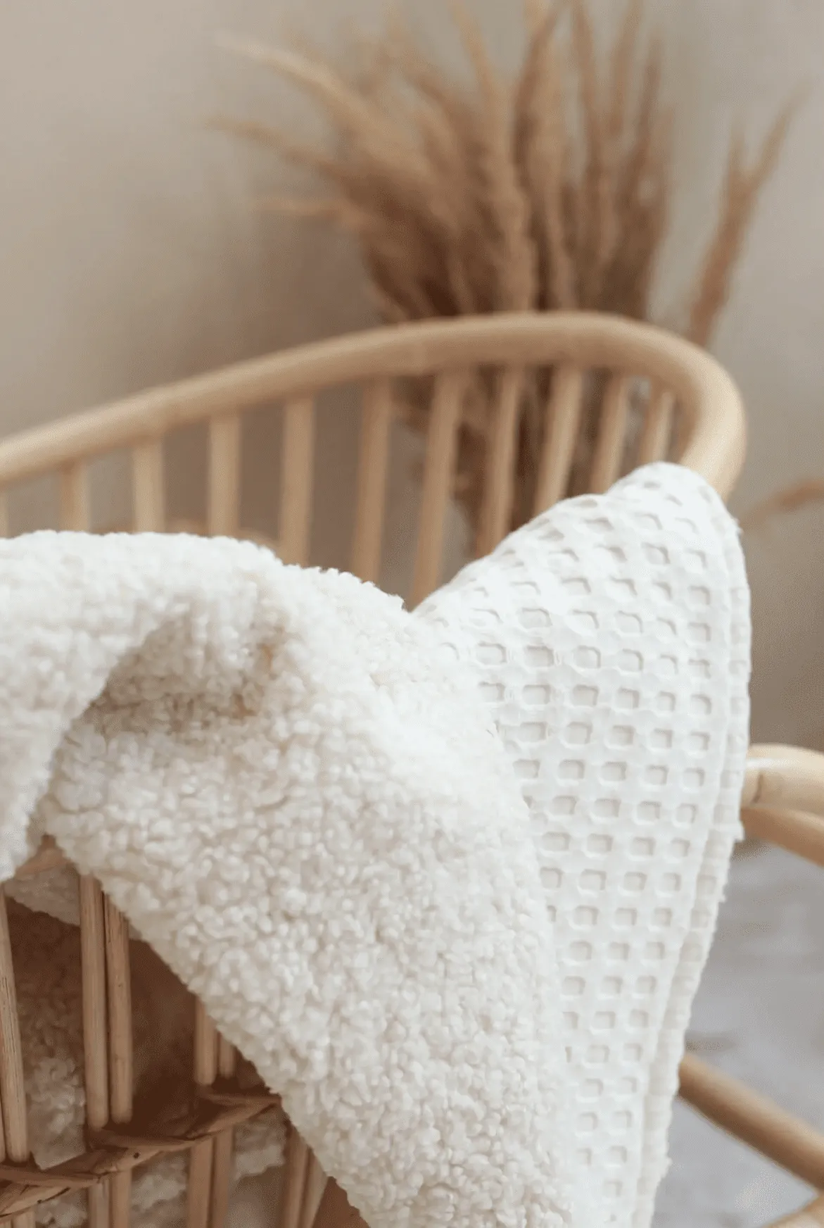 – Couverture bébé bi-matière : Tissu Sherpa 100% polyester certifié OEKO-TEX et Coton gaufré 100% coton biologique certifié OEKO-TEX