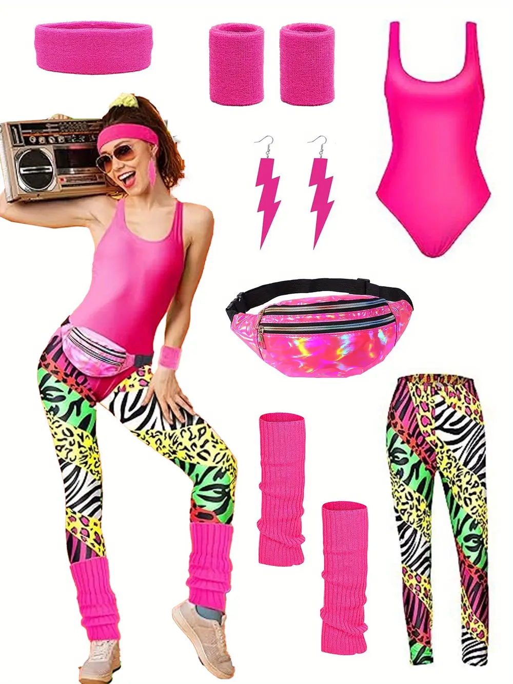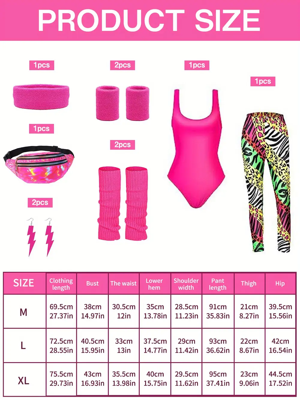 - Contient un justaucorps rétro, des leggings, une bandeau, des bracelets, des boucles d’oreilles et un sac banane fluo