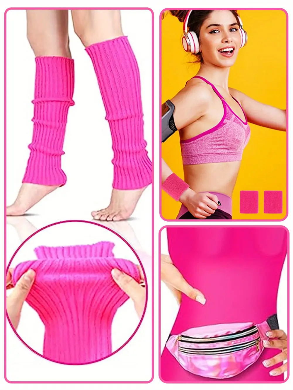 - Profitez d’un ensemble fluo années 80 femme ultra tendance avec cache-jambes, bandeau et sac banane inclus