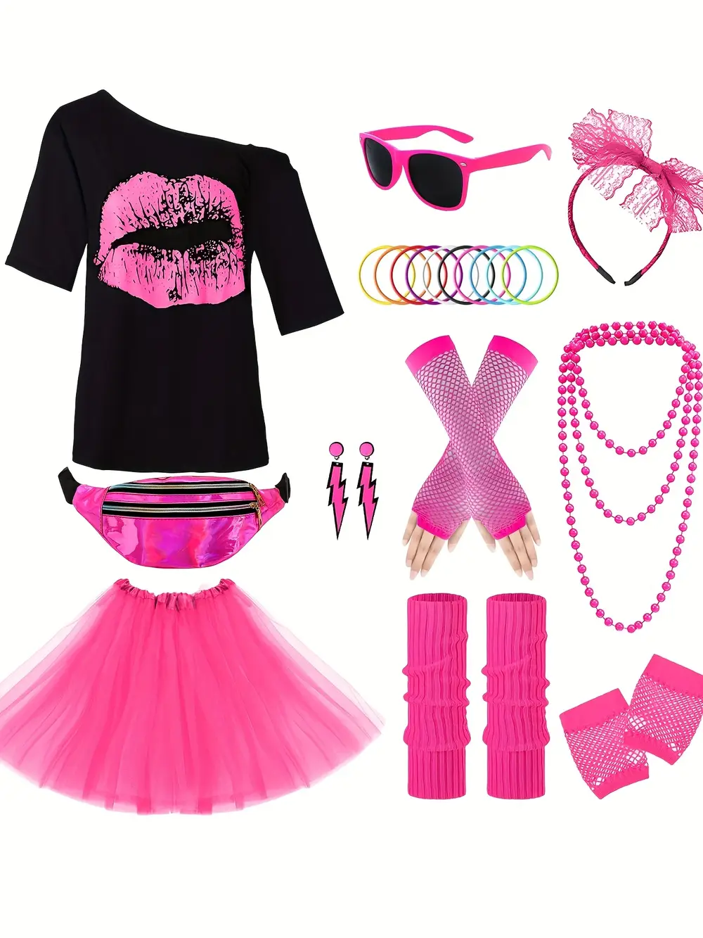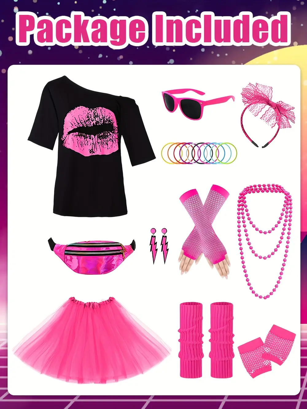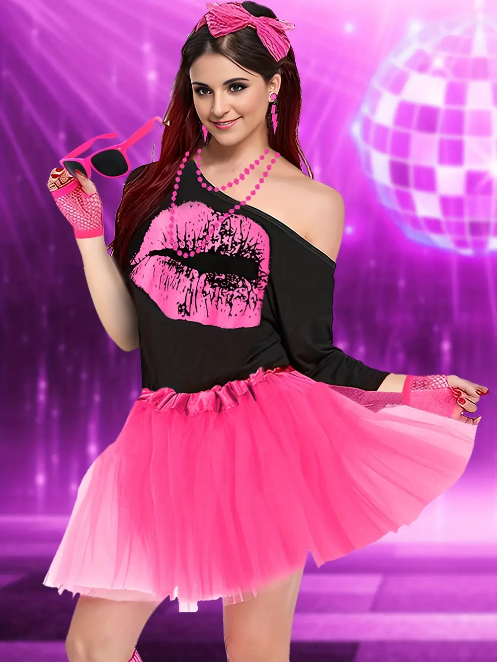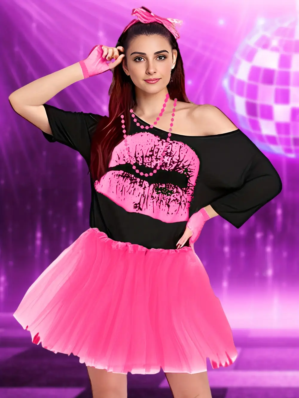- Composé d’une jupe tutu noire et d’un haut fluo à motif lèvres, il vous offre un style rétro affirmé