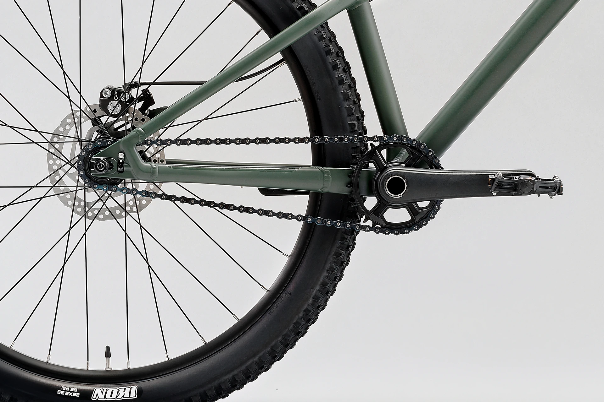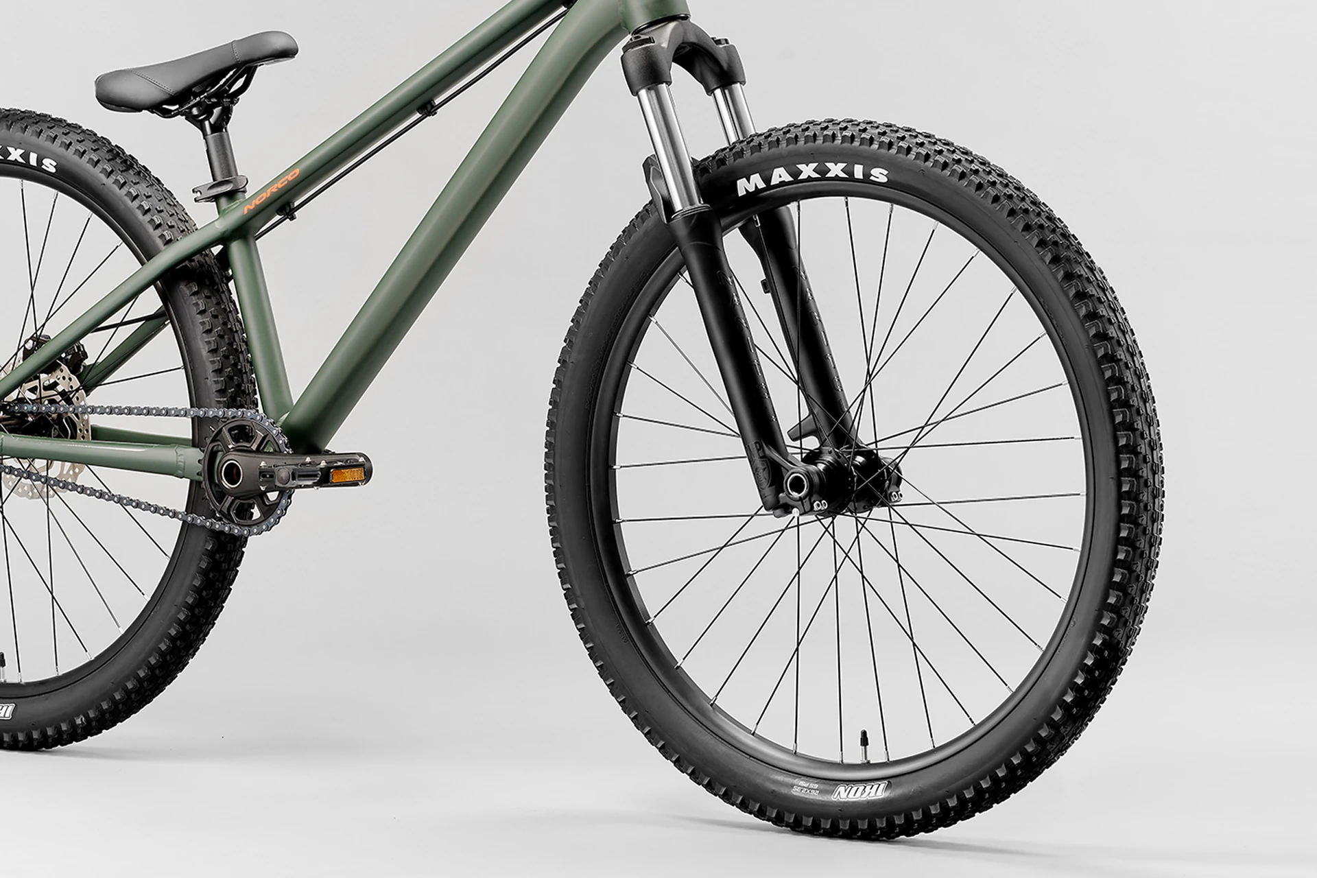 Les freins à disque mécaniques Tektro MD-280 à l’avant et Shimano Sora R317 à l’arrière, équipés de disques 160 mm, garantissent un freinage puissant et progressif pour une maîtrise parfaite avant les sauts ou en sortie de courbes serrées. Les roues de 26 pouces, montées avec des jantes Alexrims DP 25 et des pneus Maxxis Ikon 2.35″, offrent une adhérence exceptionnelle et une excellente absorption des vibrations.