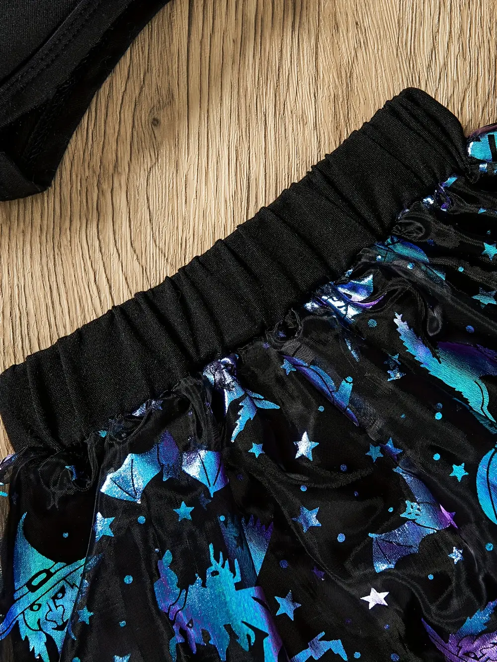 - Propose un habit de fête bébé halloween complet : body manches longues, jupe pailletée citrouille et bandeau assorti