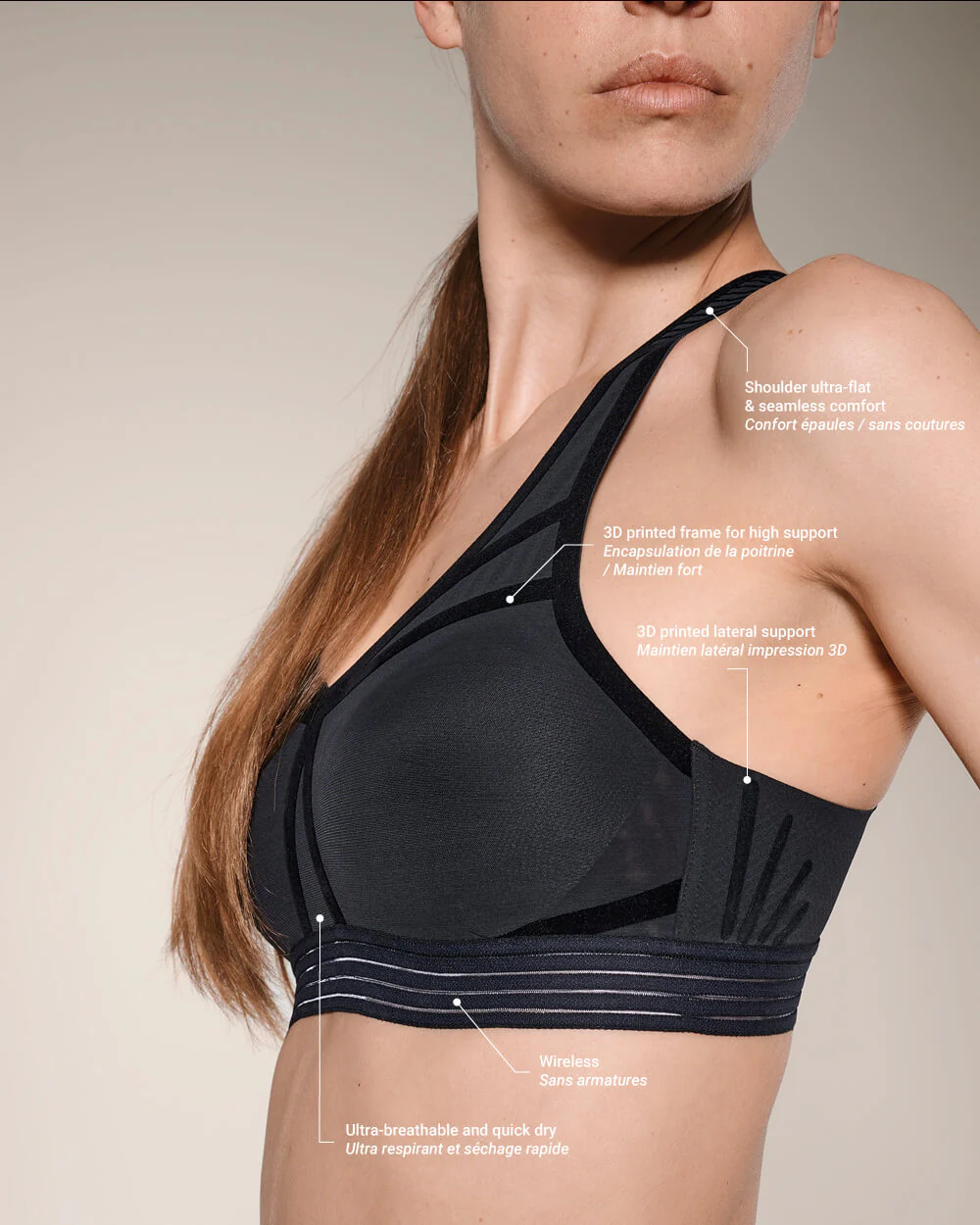 Sans armatures, effet seconde peau, idéal pour les sports à impact moyen à fort (fitness, running, cross‑fit…)