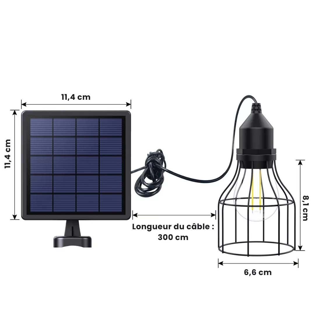 • Source de lumière : Éclairage LED chaleureux et efficace, alimenté par une batterie solaire intégrée.