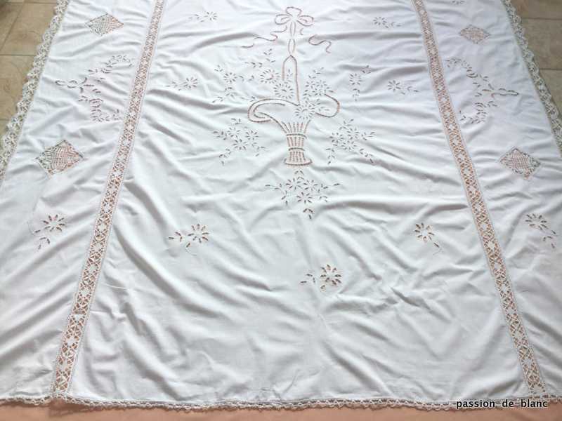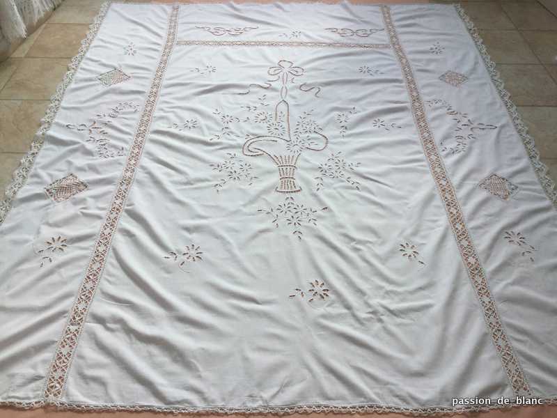 Dimensions : longueur : 2,25 m x 2,05 m dont dentelles – le rectangle central avant l’entre- deux: 1,80 m x 1,10 m.