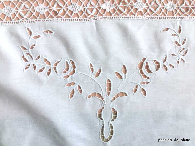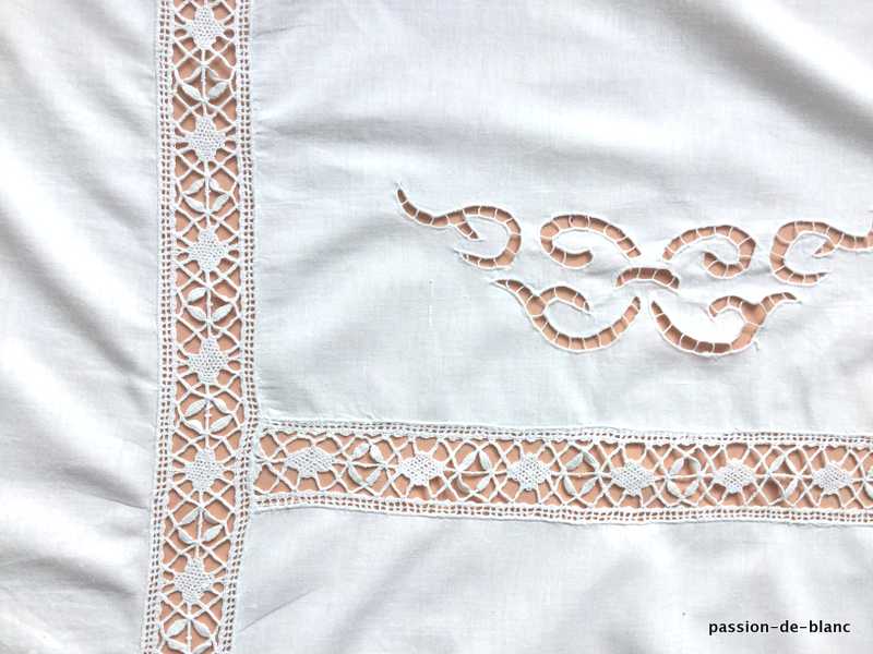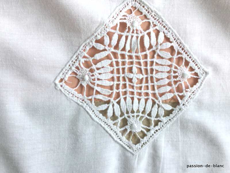 Une dentelle ( 6 cm ) termine les 2 côtés en largeur tandis que les 2 autres se terminent par une autre de 2 cm. L’entre-deux mesure 6 cm.