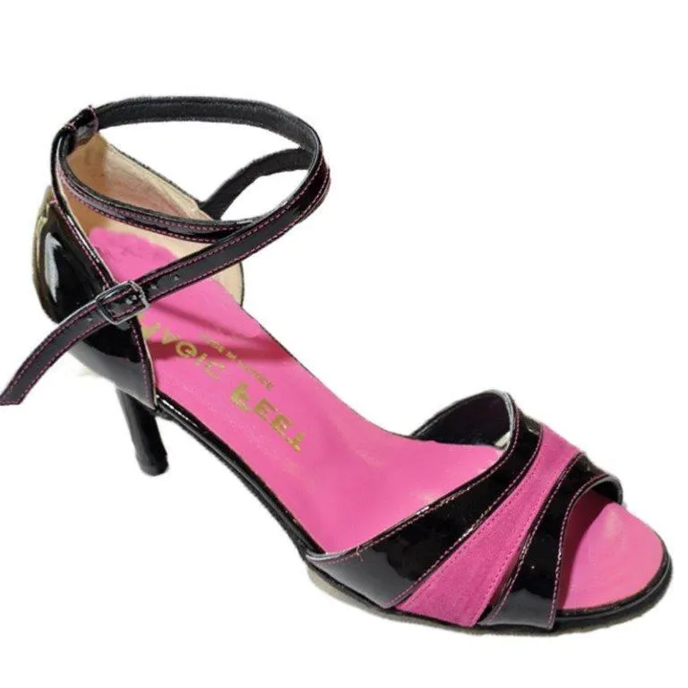 • Chaussures de danse réalisées en cuir vernis noir et daim rose