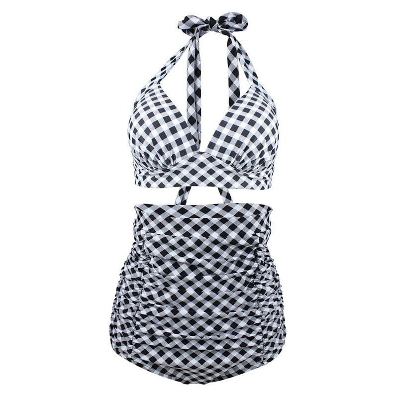 Ce maillot de bain vintage vichy noir et blanc est un véritable hommage à la mode rétro. Avec son imprimé vichy intemporel, il apporte une touche élégante et originale à votre garde-robe estivale. Conçu pour mettre en valeur vos courbes naturelles, ce modèle deux pièces à taille haute combine à la fois féminité et confort.