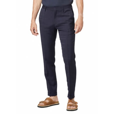 On y retrouve deux poches plates à l’arrière et deux poches italiennes à l’avant. Sur la cheville se trouve un ourlet ainsi qu’une doublure noire en cupro.
