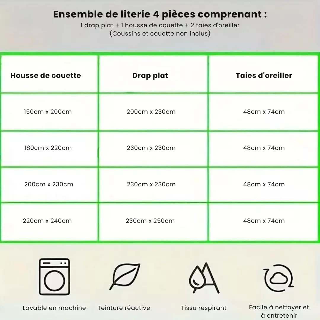 - Inclus : Housse de couette et taies d’oreiller assorties, pour une harmonie parfaite dans votre chambre.
