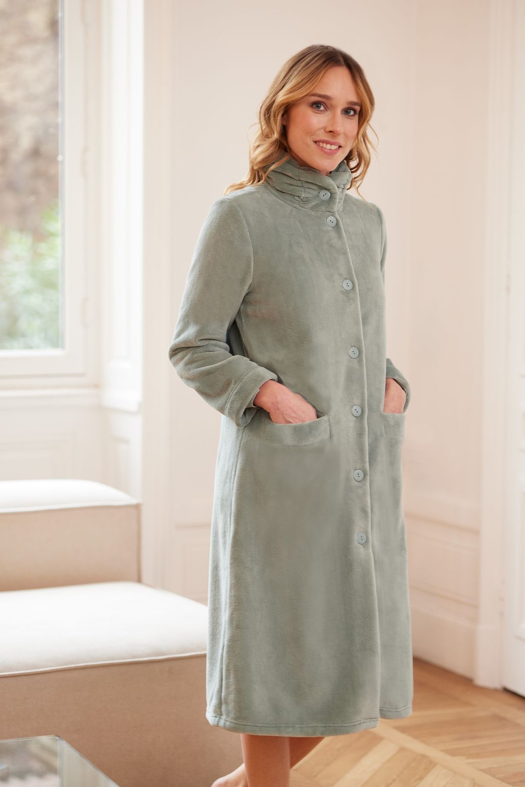 La robe de chambre vert-olive avec boutons Canat possède deux grandes poches latérales et un col haut. Sa matière polaire vous enveloppera d’une grande douceur.