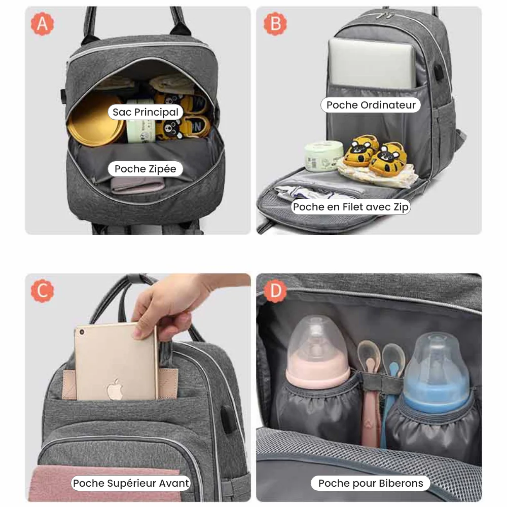 Le sac à dos à langer est facile à transporter et dispose de deux poignées et deux anses épaule réglables pour un transport main-libre. Il est également équipé d’un port USB pour brancher un chauffe-biberon et d’une pochette extérieure isotherme pour garder les biberons au chaud.