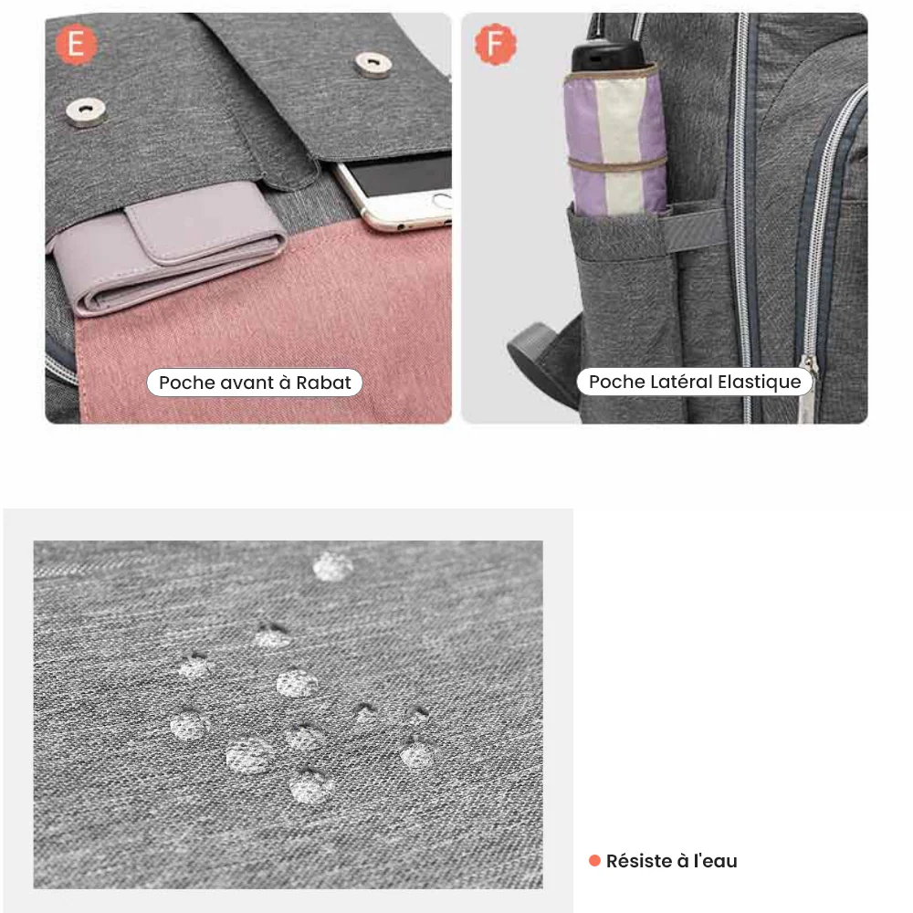 Fabriqué en toile anti-saleté et anti-humidité, le sac à langer est imperméable et protège les affaires de votre bébé contre les éléments. Vous pouvez également compter sur les attaches poussette fournies avec le sac pour un transport en toute sécurité.