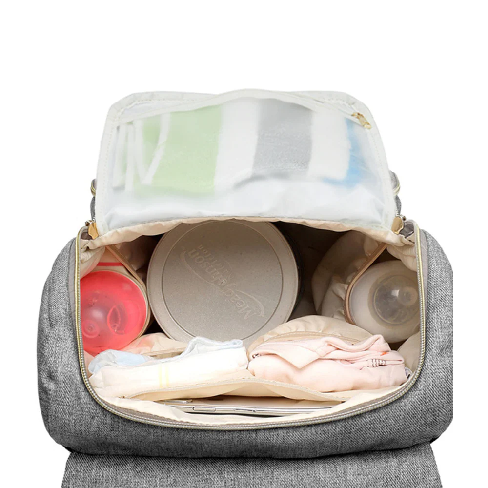 Le sac à langer est doté de 13 rangements intelligemment conçus, y compris de grandes pochettes élastiquées et zippées à l’intérieur, et 6 autres rangements à l’extérieur, y compris une poche isotherme zippée et deux portes-bouteille. En plus, vous pouvez brancher le chauffe-biberon fourni sur le port USB pour garder les biberons au chaud grâce à la pochette isotherme.