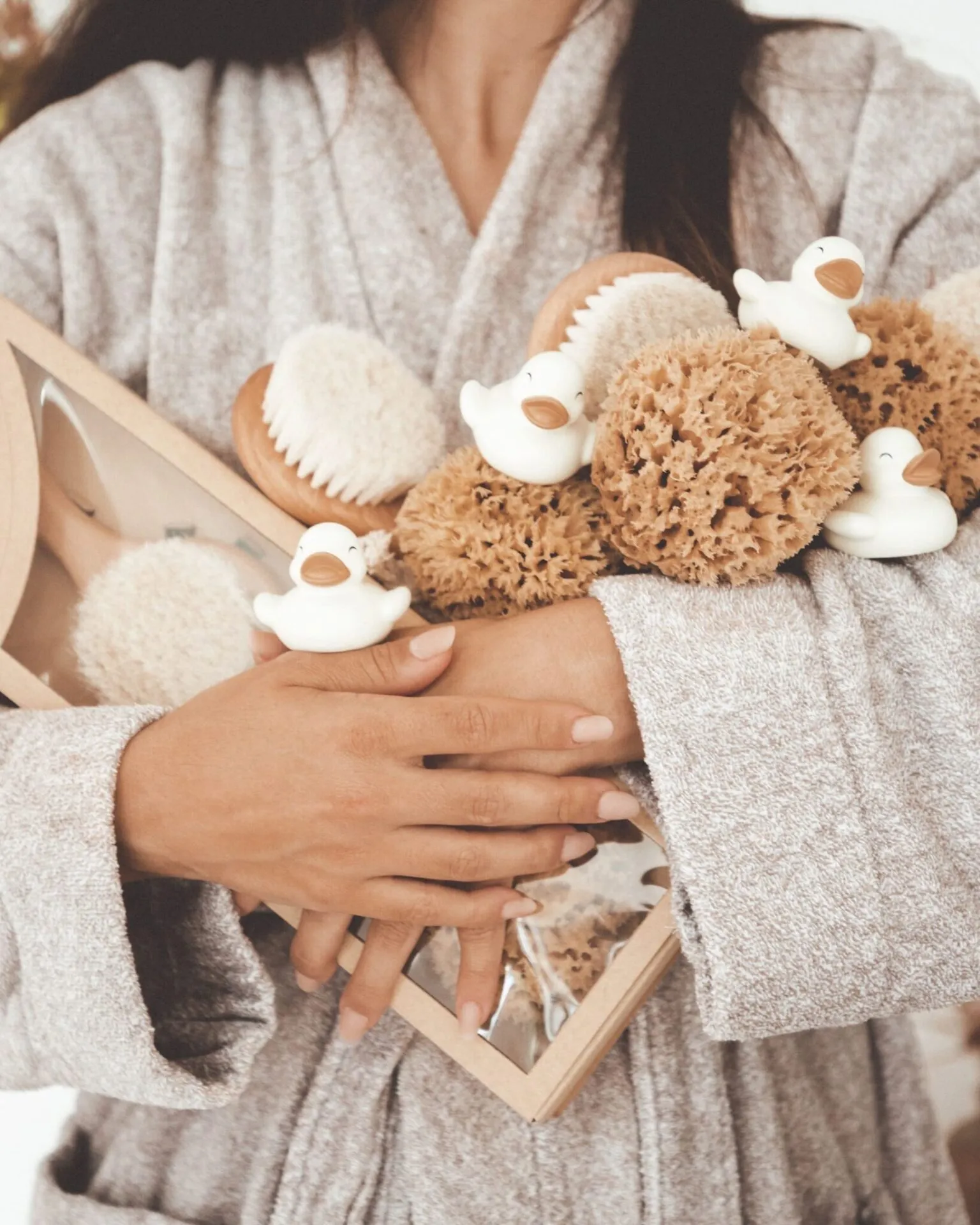 – Set de bain comprenant : une brosse à cheveux en bois, une éponge et deux canards de bain.