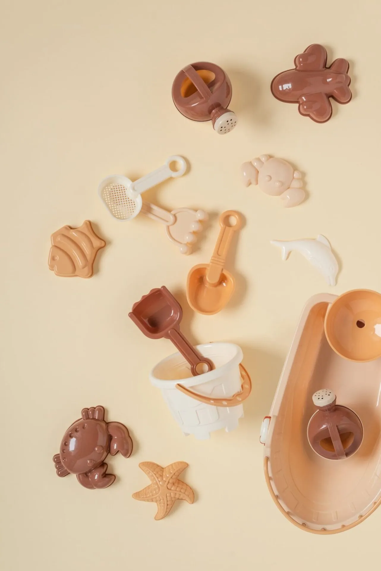 – Composé de 14 pièces : 4 pelles, 6 moules, 1 arrosoir, 1 seau, 1 moulin à eau et 1 bateau