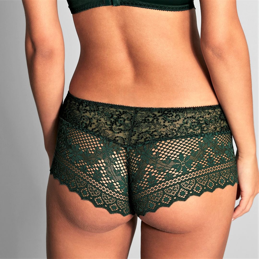 Le shorty Cassiopée Emeraude Empreinte est une pièce emblématique avec sa dentelle à l’avant et à l’arrière. Il mettra en avant toutes les carnations.