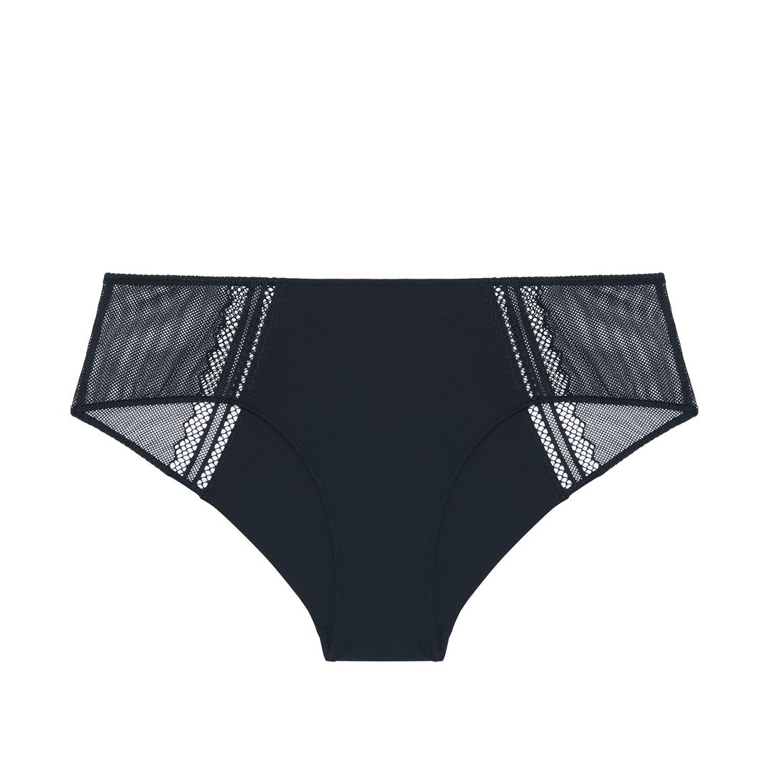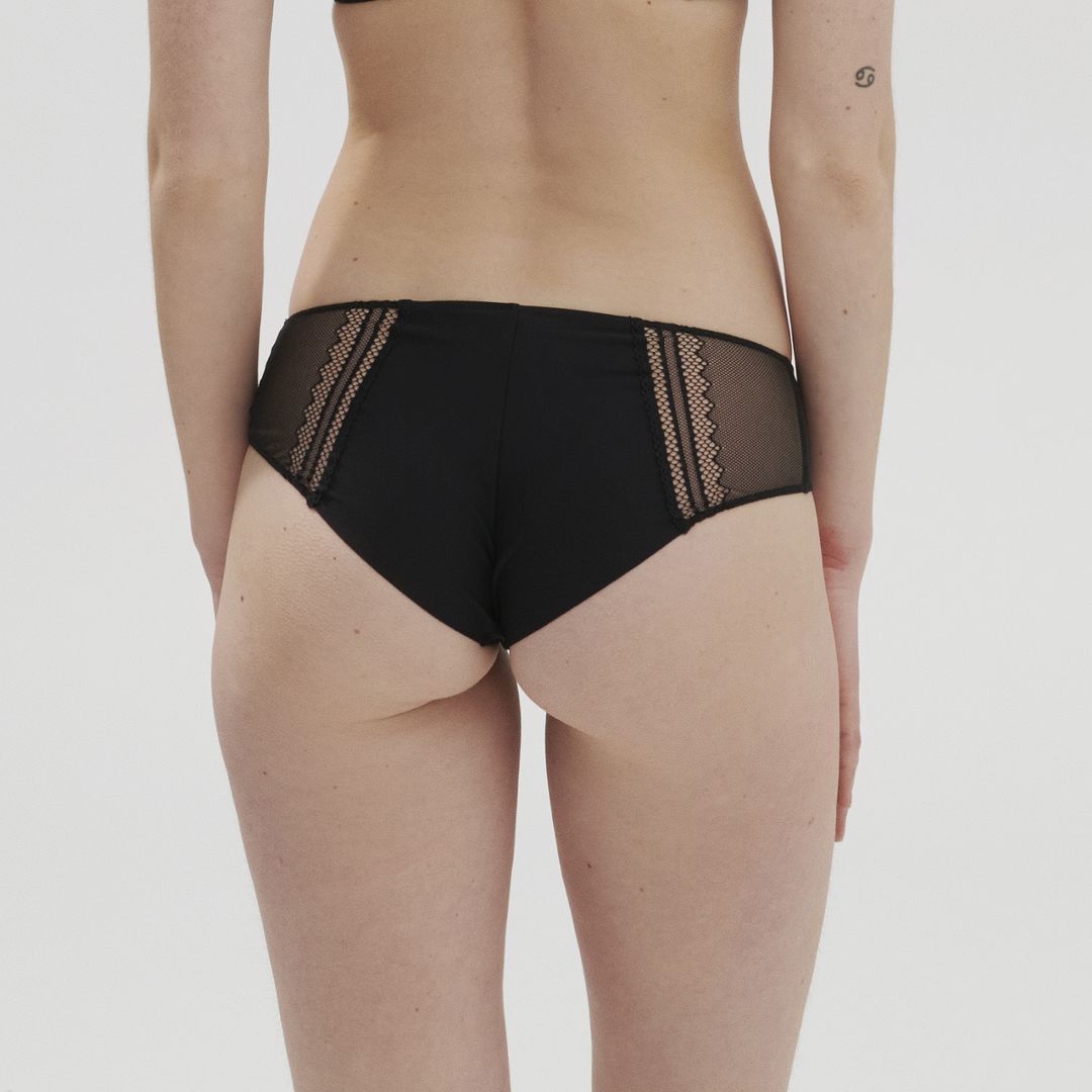 Le shorty noir Olympe Simone Pérèle est en maille avec de la dentelle résille recyclée. Il est opaque à l’avant et à l’arrière et offre une légère transparence sur les côtés. Il est sans coutures et donc invisible sous les vêtements.