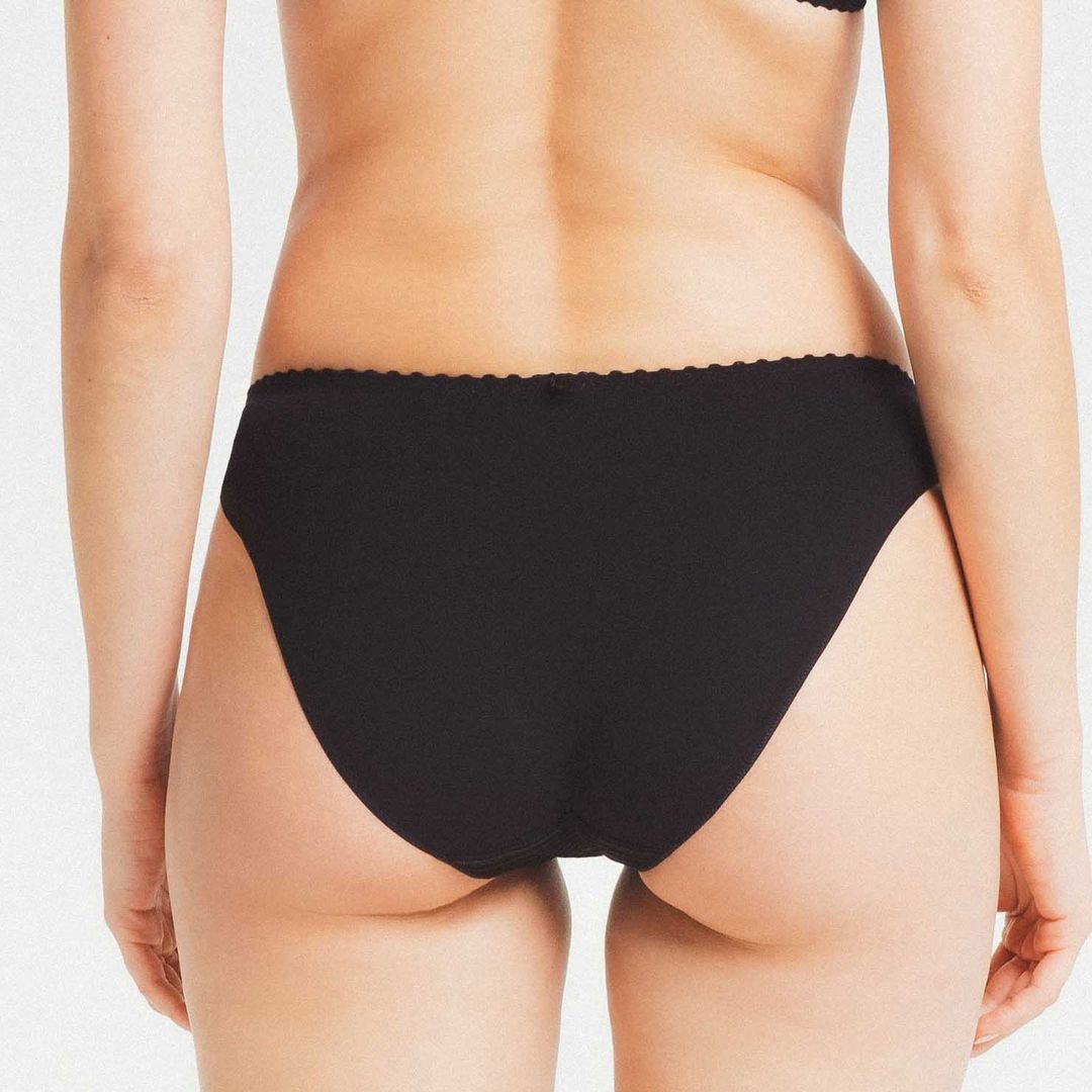 Le slip Elise Louisa Bracq est en maille plissée à l’avant. Les côtés sont arborés d’une broderie de feuilles à effet nacré avec un jeu de transparence.