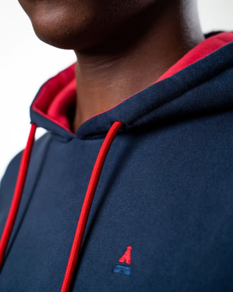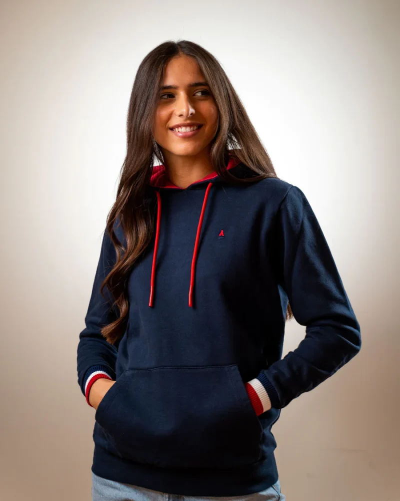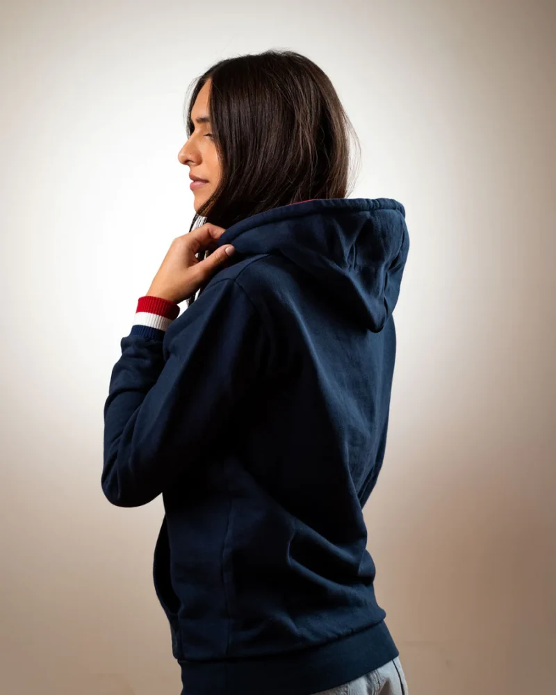 Qui n’a pas rêvé d’un sweat-shirt tout doux qui puisse être porté avec tout et partout ? Fabriqué au Portugal à base de coton bio, l’intérieur de la capuche contrasté de rouge et les bords cotes tricolores (signature de la marque) animent juste comme il faut ce grand basique qui conviendra à monsieur comme à madame.