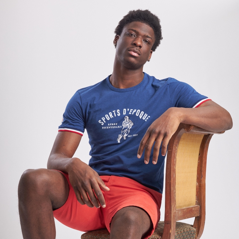 Un T-Shirt jersey aux codes vintages qui collent parfaitement à l’évènement. Le coloris bleu retro se coordonne parfaitement au bord-côtes tricolore utilisé au bas des manches et à la bande de propreté intérieure aux couleurs délavées. Il est tricoté dans un coton premium flammé qui renforce son côté authentique en apportant une irrégularité dans le tricot. Le joueur et la date sont brodées quand le texte est imprimé sur la poitrine.