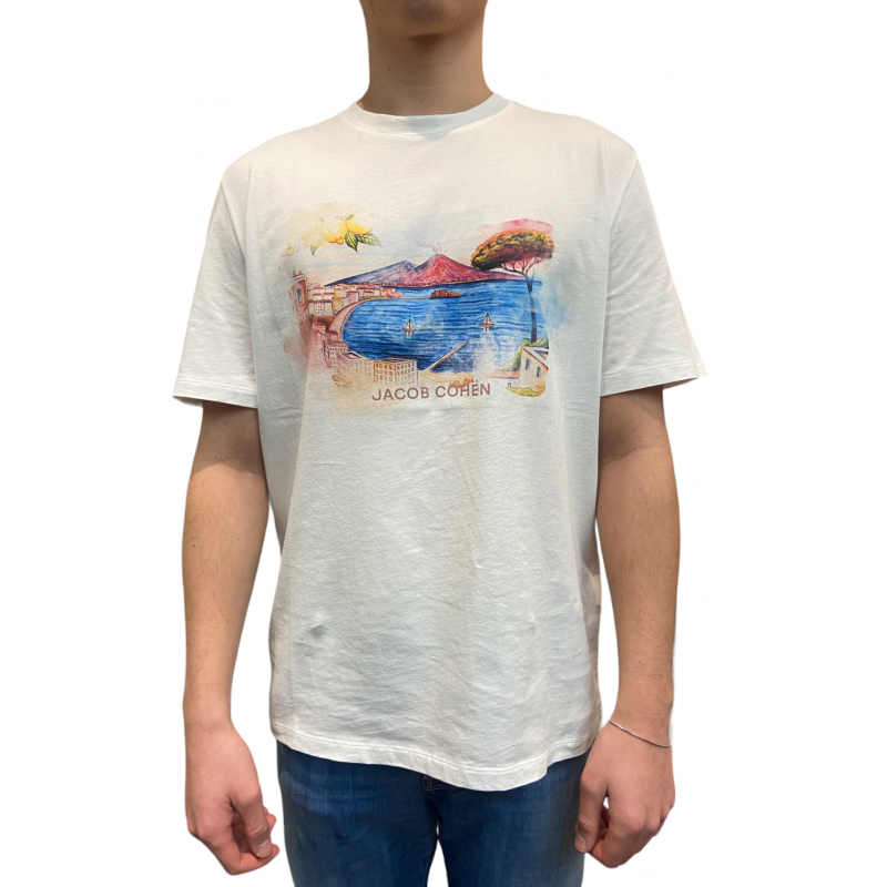 Le t-shirt blanc de la marque Jacob Cohen arbore un motif inspiré des paysages estivaux de Naples vue sur le Vésuve.
