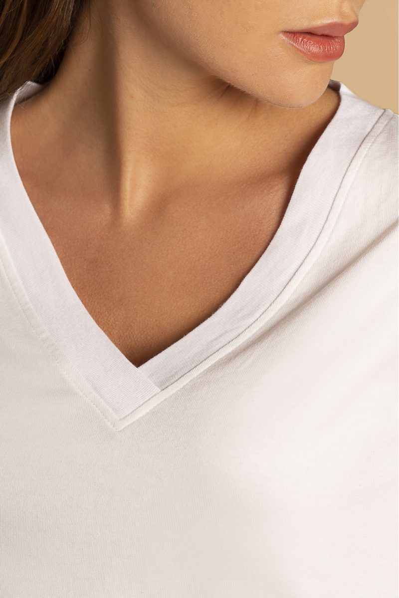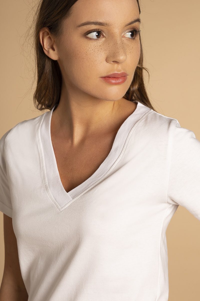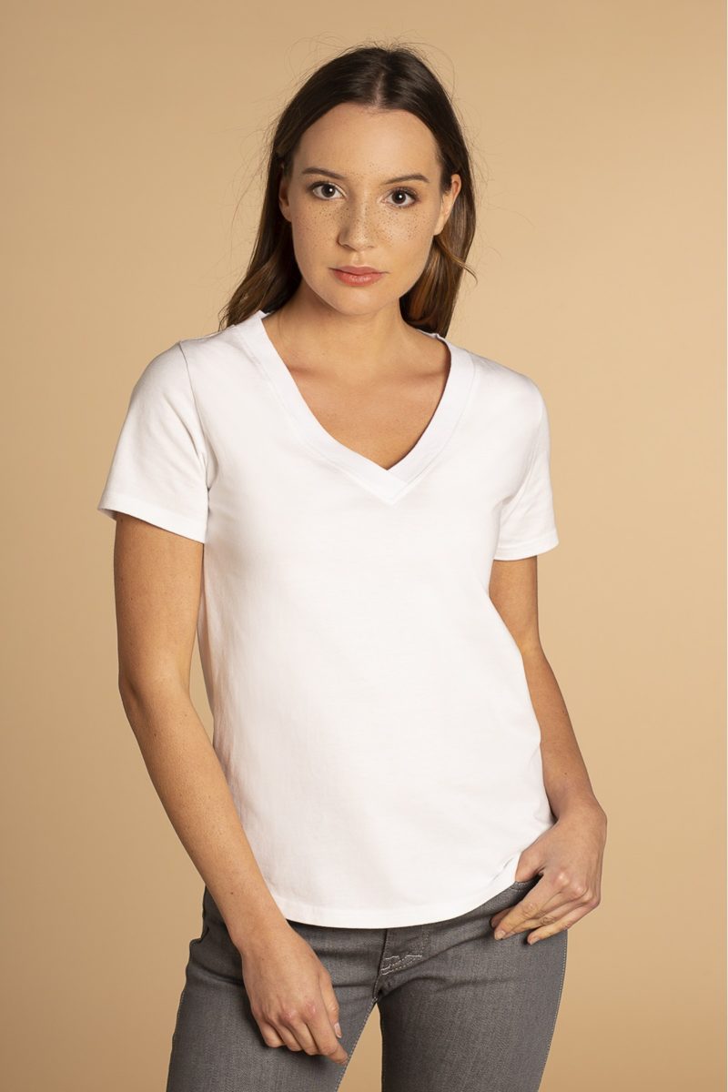 Tricoté et confectionné en France, ce T-Shirt à col V souligne parfaitement le décolleté. Son jersey dense et doux vous accompagnera au quotidien confortablement et pour longtemps.