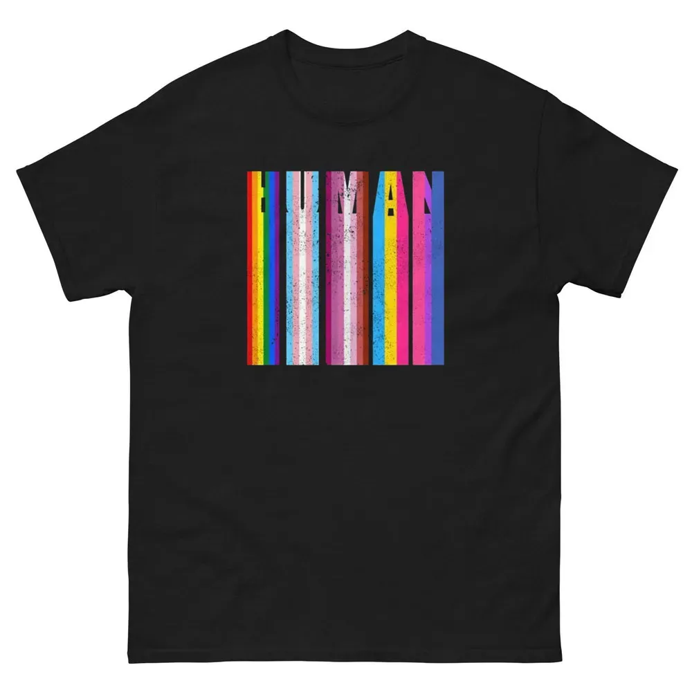 T-shirt LGBT Human, Ce T-shirt noir affiche fièrement le mot « HUMAN » en lettres majuscules au travers de barres verticales colorées. Chaque lettre est intégrée dans une bande de couleur différente, formant un arc-en-ciel vibrant qui représente la diversité et l’inclusion. Les couleurs contrastent nettement avec le fond noir du T-shirt, rendant le message à la fois audacieux et accueillant.
