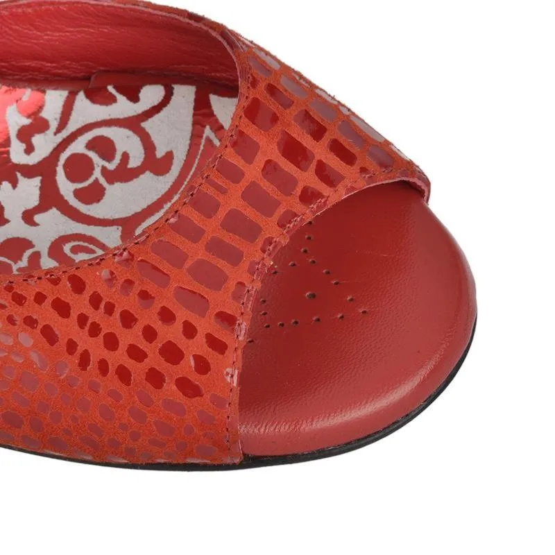 • Chaussures de tango entièrement réalisées en cuir doux imprimé python rouge brillant