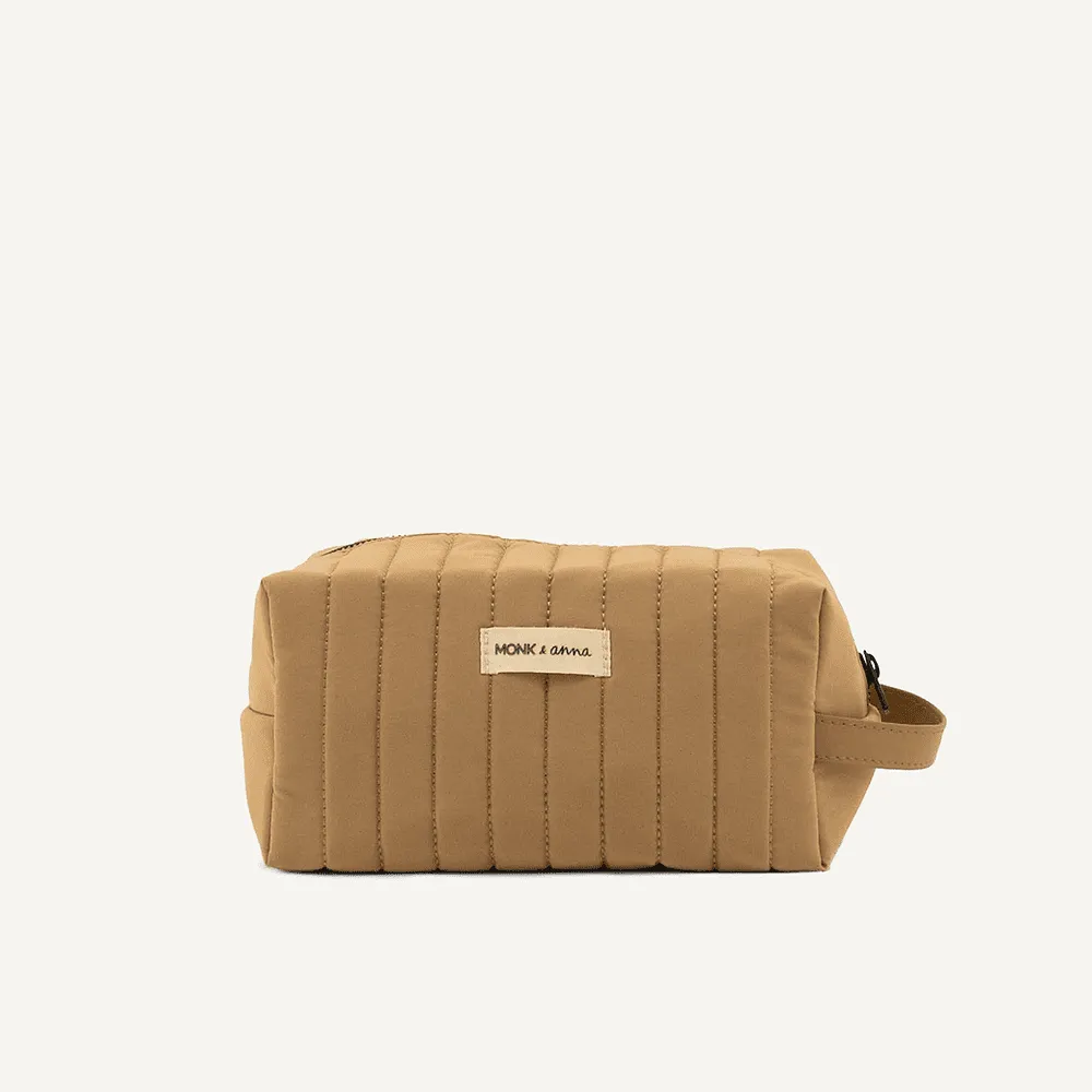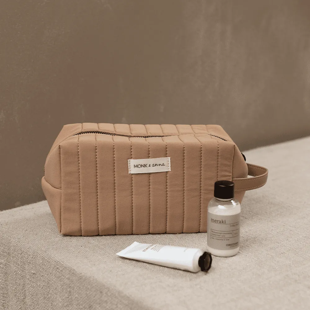 Emportez tous vos essentiels dans cette trousse de toilette matelassée beige de la marque Monk and Anna !