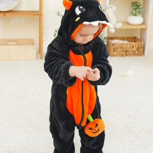 Grenouillère bébé à capuche dinosaure motif citrouille – polaire douce