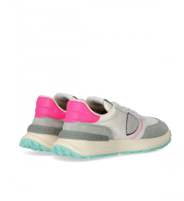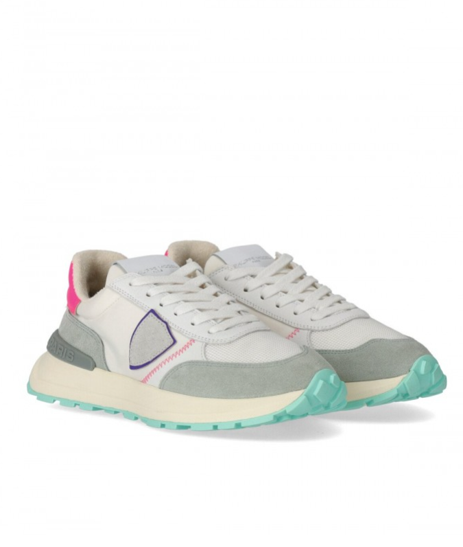 Baskets de la marque Philippe Model modèle Antibes, en nylon de couleur blanc et avec de la suède grise et des semelles vert d’eau. Fabriquées en Italie.