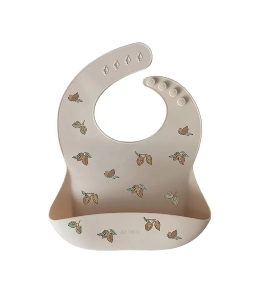 Le joli bavoir en silicone souple Amandes – de chez Zakuw – est idéal pour garder les vêtements de votre bébé propres durant ses repas !