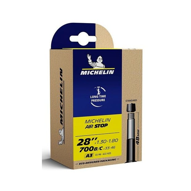 La chambre à air Michelin A3 Airstop 28 x 1,30-1,80 / 700B/C x 33-46, référence CAI 333083, de la gamme Access Line, garantit une excellente rétention de la pression grâce à sa conception en butyl et offre une résistance accrue aux crevaisons. Reconnu comme un produit phare du marché, elle combine fiabilité et rapport qualité/prix avantageux.