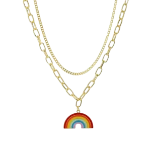 Composé d’une chaîne dorée de 39 cm, accompagnée d’une rallonge de 7 cm pour un ajustement parfait. En son centre, une perle ronde de 1 cm arbore fièrement les six couleurs emblématiques du drapeau LGBT. L’ensemble ne pèse que 5 g, ce qui le rend à la fois léger et confortable.