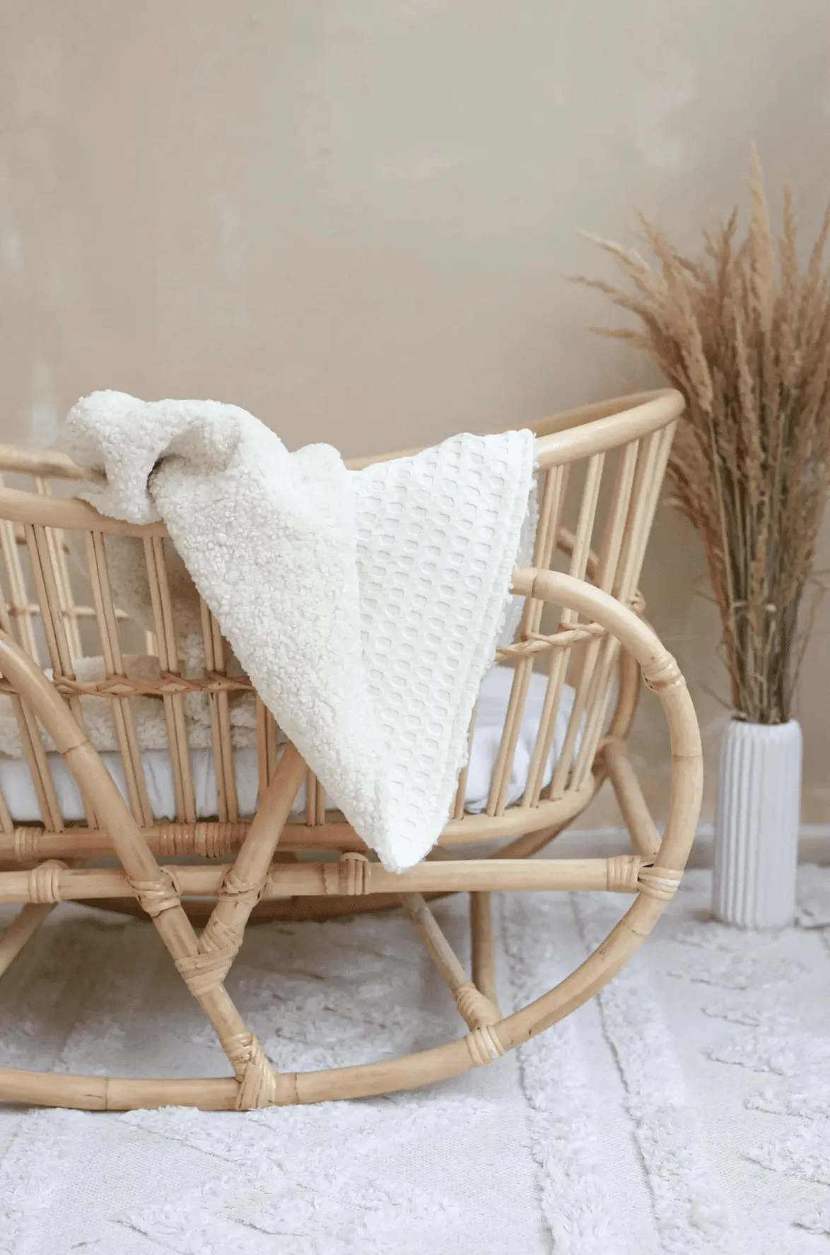 – Couverture bébé bi-matière : Tissu Sherpa 100% polyester certifié OEKO-TEX et Coton gaufré 100% coton biologique certifié OEKO-TEX