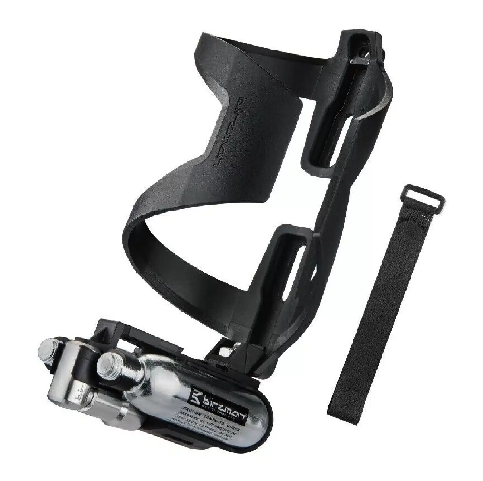 Kit de réparation CO2 ultra-compact comprenant deux cartouches, un embout de gonflage et une sangle Velcro pour chambre à air. Compatible avec les porte-bidons latéraux Birzman BM-ACC-0018 et BM-ACC-0017.