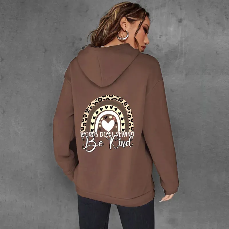 - Design: Le design minimaliste avec le texte inspirant « Words Don’t Rewind, Be Kind » fait de ce sweat une pièce aussi élégante que significative.
