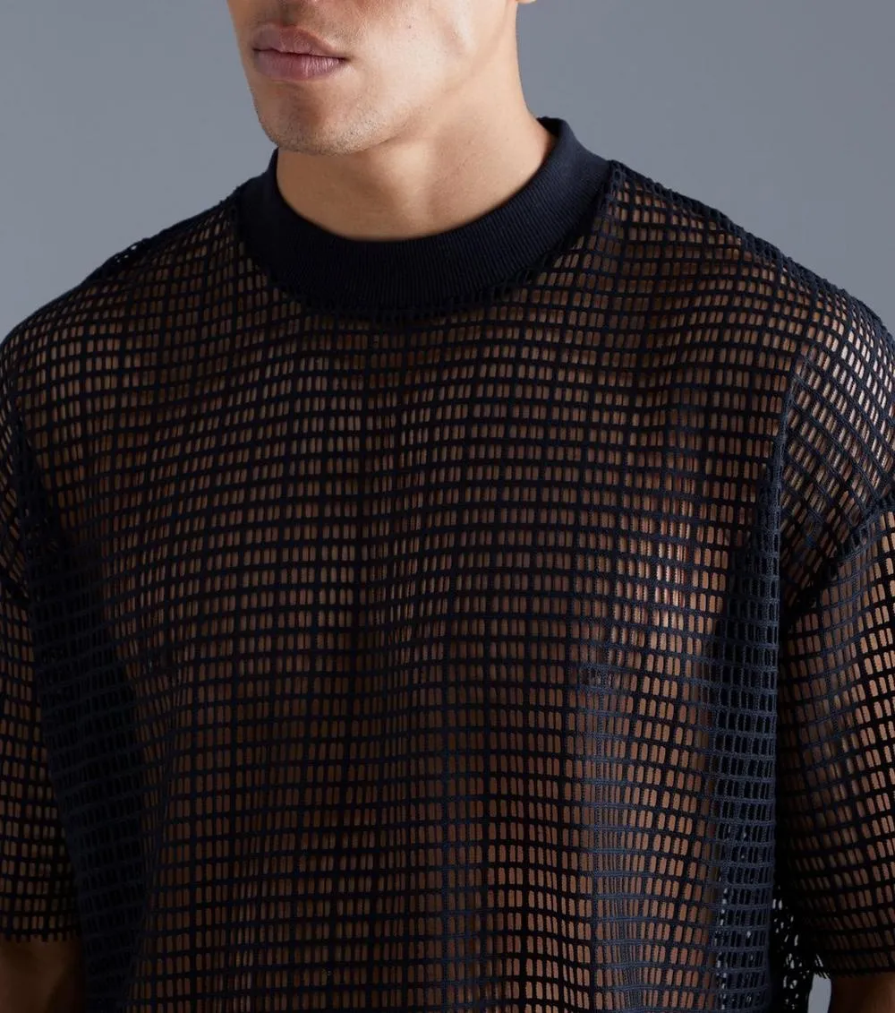 Laissez-vous séduire par notre T-shirt mesh oversize à col montant. À la fois audacieux et décontracté, ce T-shirt est la pièce de résistance qui apportera une nouvelle dimension à votre garde-robe. Son design contemporain s’accorde avec une variété de styles, lui conférant une polyvalence inégalée.