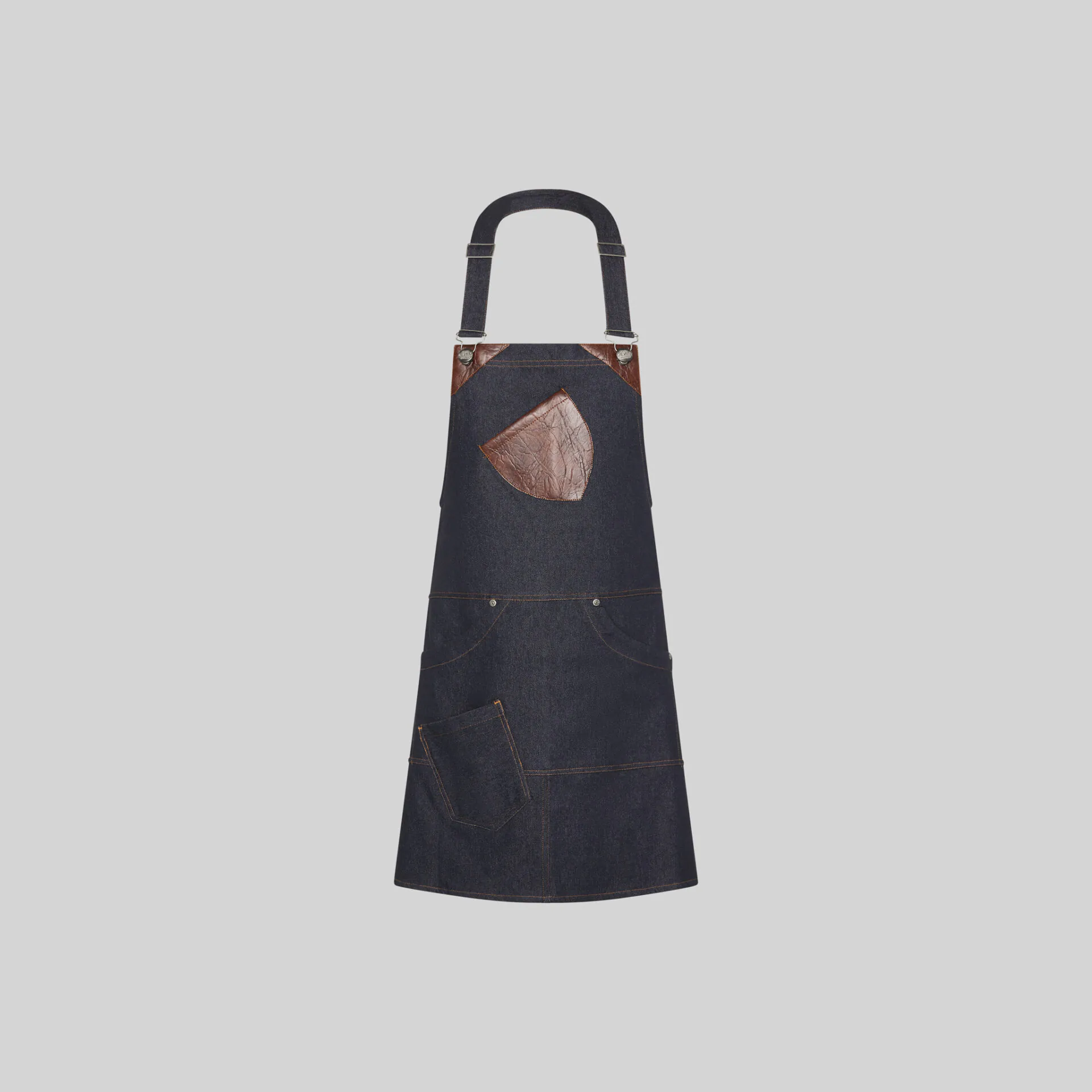 Tablier à bavette tendance, pour son style et sa fonctionnalité, en denim extensible.